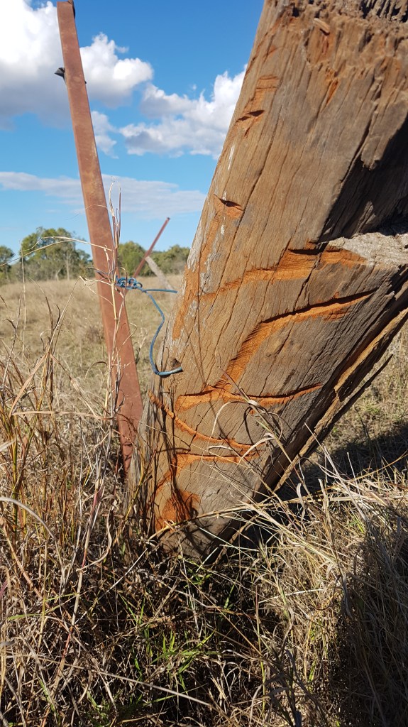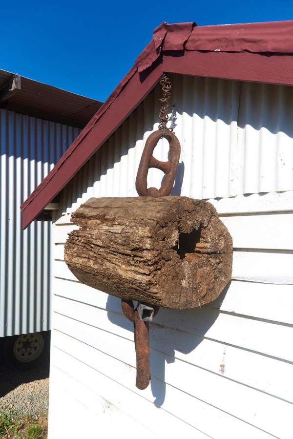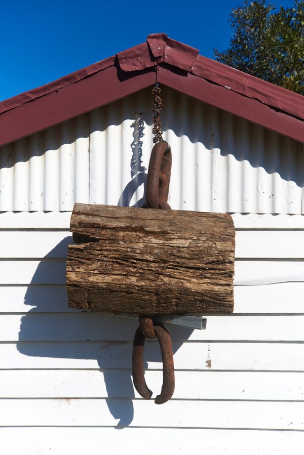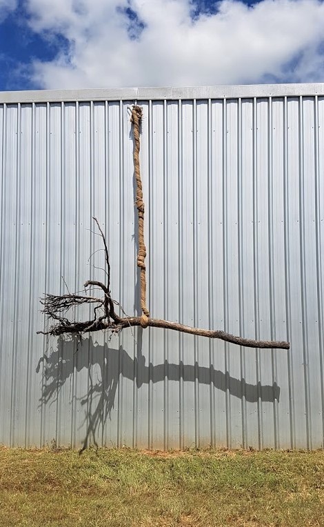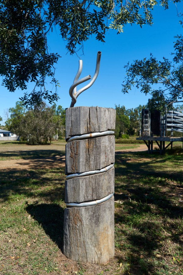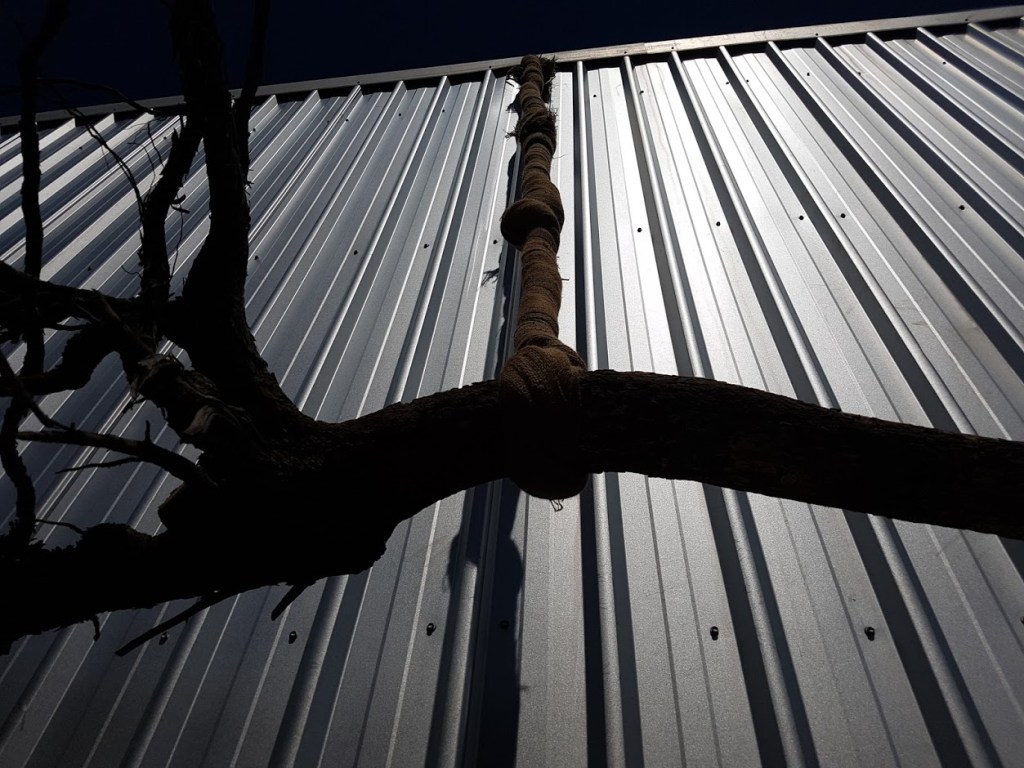The twist of hessian is prevented from unraveling by the dead tree in close proximity to the shed wall thereby capturing energy & tension. The tree was uprooted in the flood of 2017, an extreme weather event. Sadly these are becoming more frequent & intense in Australia.