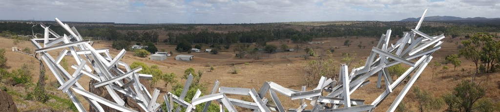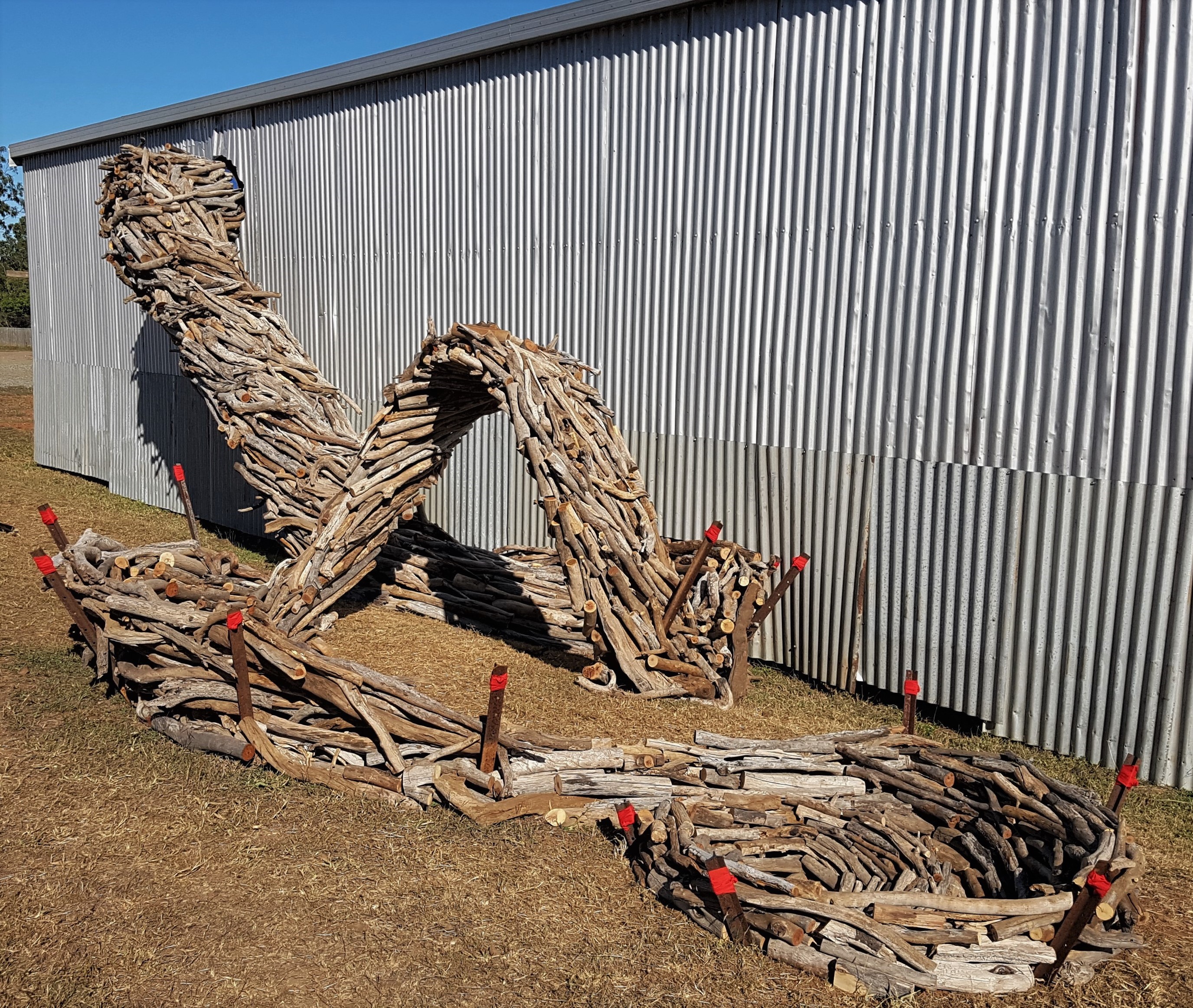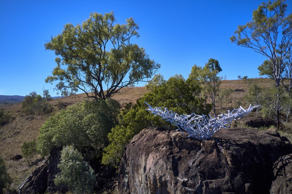 Referencing the nest of the Wedge Tail Eagle, this 3D steel ‘drawing’ perches on a high rocky outcrop behind the farm buildings. The contrast of the steel set against the organic creates tension and suggests human influence on the natural environment impacting native wildlife.