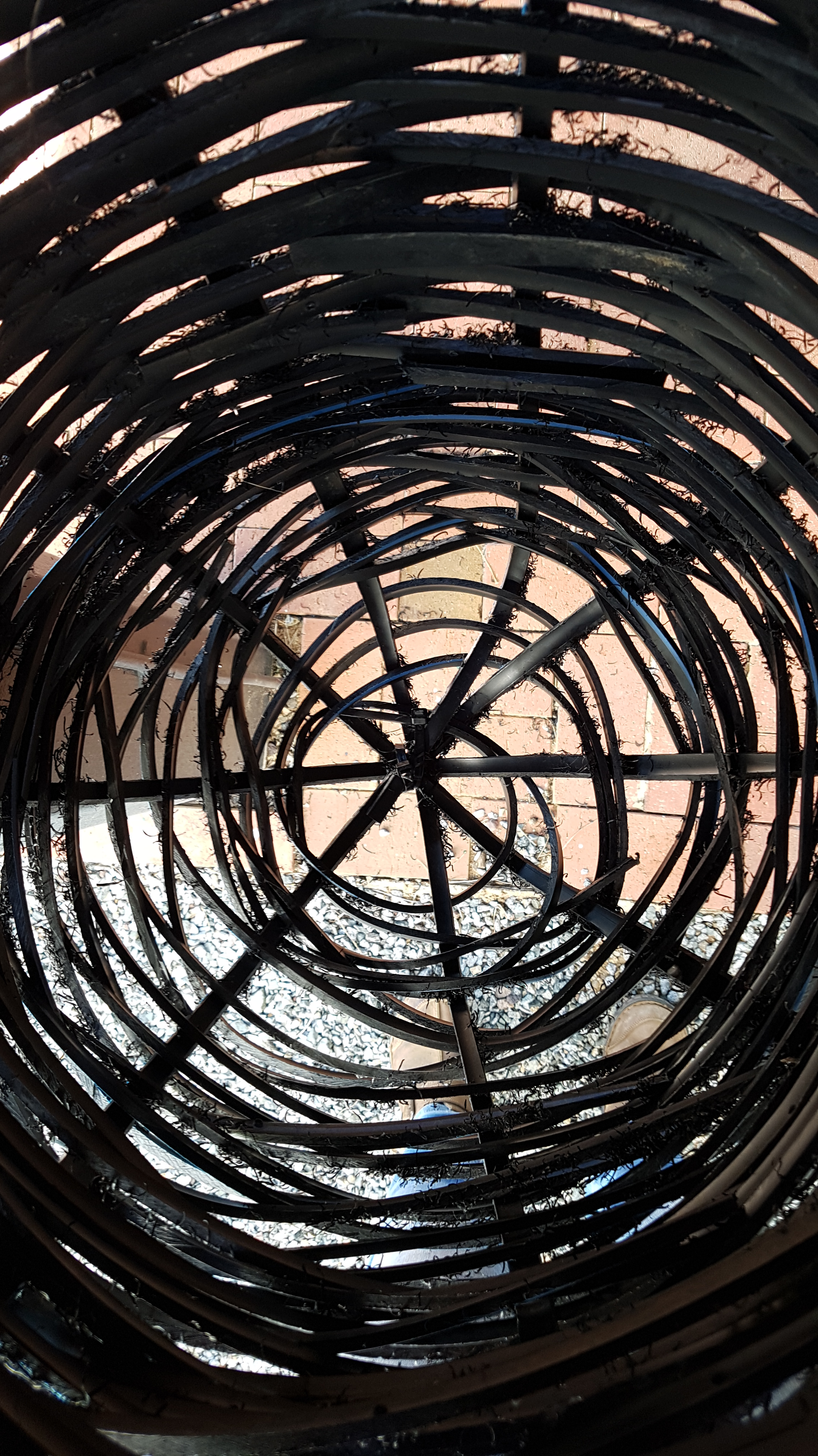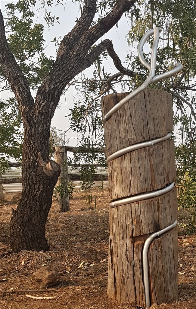 The constrictive steel coil suggests the rubber vine weed, an invasive climber targeting trees & explores the tension of climate conscience.