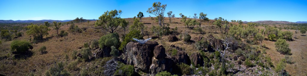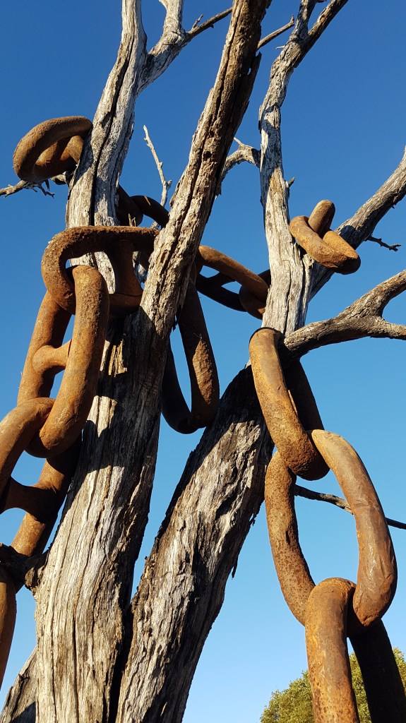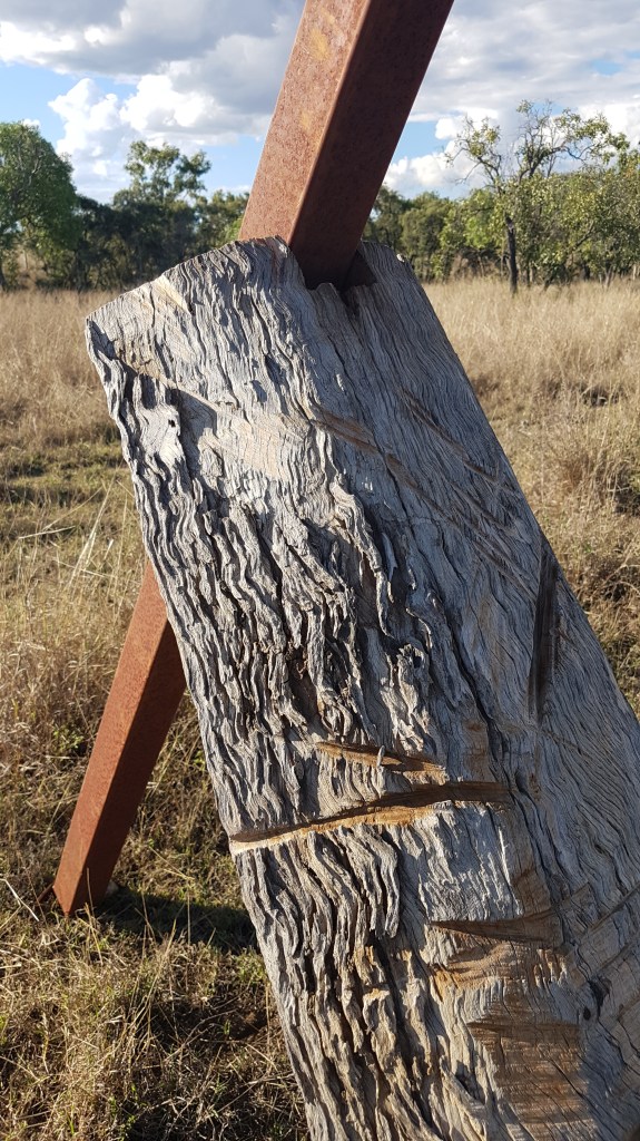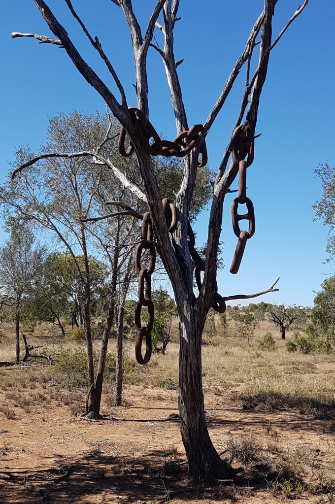 A broken section of a very heavy industrial chain with a history of tree clearing (pulling over trees with the chain strung between 2 bulldozers) was discovered locally, half buried in the red dirt. Its intrinsic conceptual meaning was very valuable to me & I decided to hang it in a dead tree – dysfunctional weapon with victim. A dystopian statement.