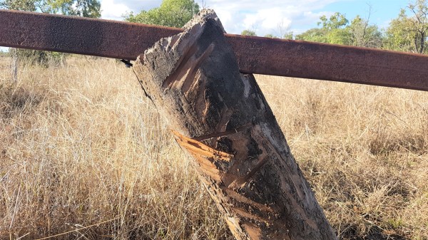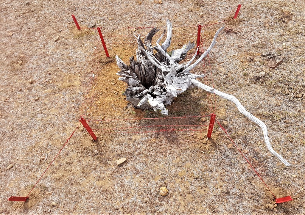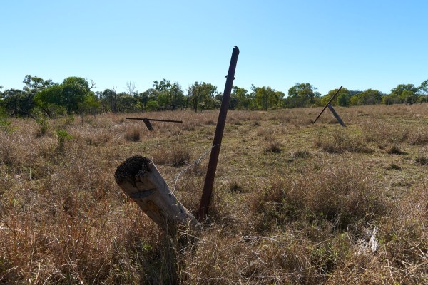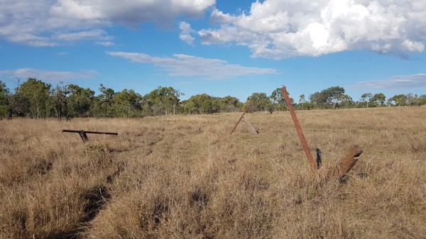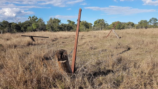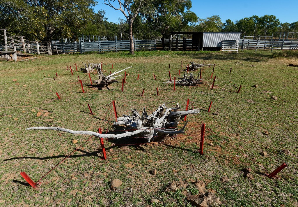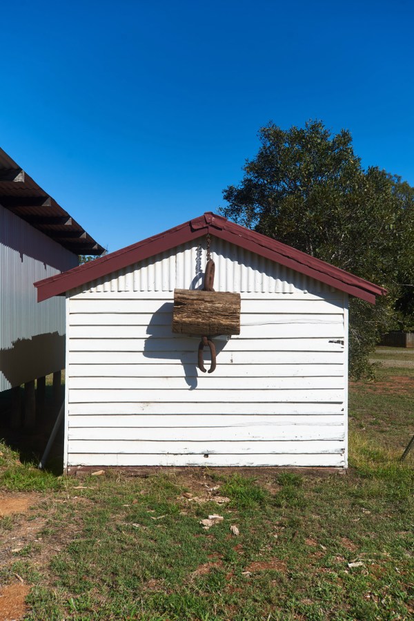 Trees overturned in the flood have had their roots exposed to the elements for three years, creating extraordinary sculptures in themselves. This work, placed within the cattle yards, presents five of them in a way that evidences human influence on nature.