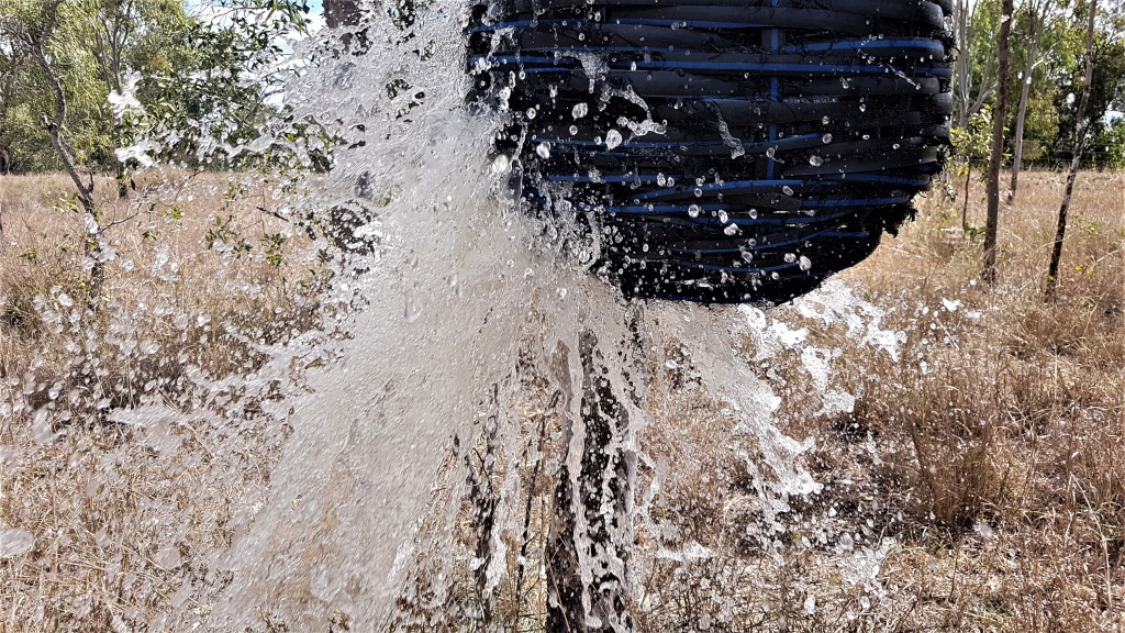 Set in the dry creek surrounds the act of pouring water into the vessel demonstrates its inability to contain this fundamental resource & alludes to the mismanagement of Australian waterways.